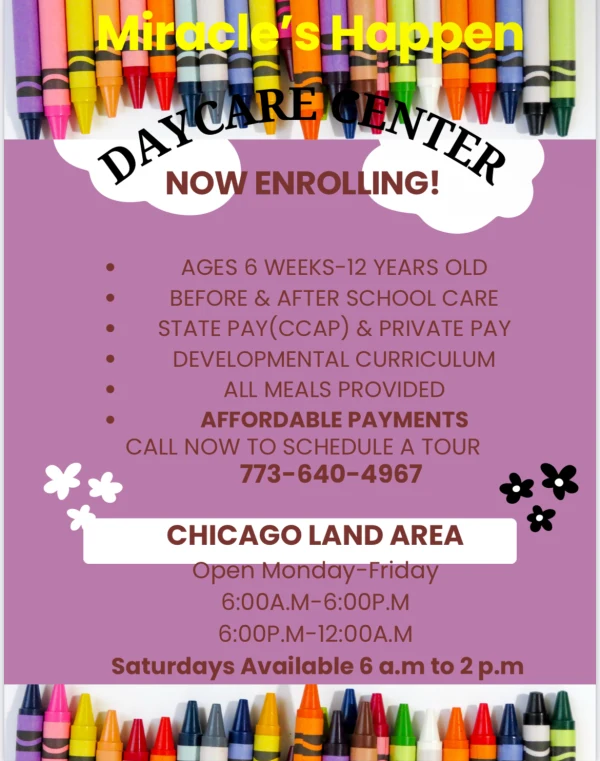 Welcome to Miracle Happens Daycare, where your child's growth and happiness are our top priorities. Located in the heart of Chicago, we are dedicated to providing a nurturing and safe environment for your little ones to explore and thrive. We are committed to fostering a love for learning through engaging activities and compassionate care. At Miracle Happens Daycare, every day is an opportunity for your child to discover their potential and for us to support their developmental journey. Join us and watch the miracles happen!